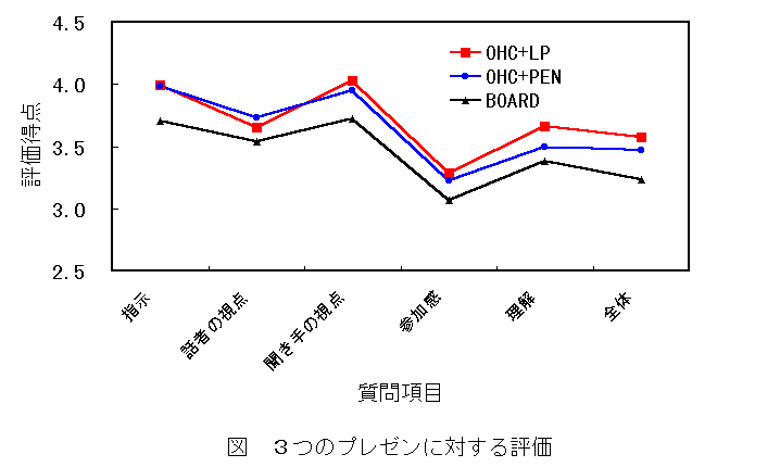 授業中に次の3つの違ったプレゼンテーションで行ない,それについて受講生に評価をしてもらいました。1.OHC+LP 図をOHCでスクリーンに提示し,レーザーポインタで指示した。