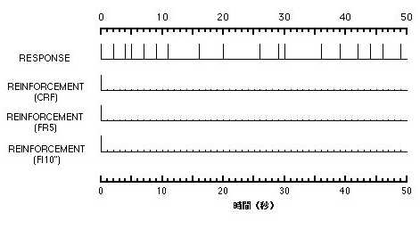 次の図(図2)は,反応に対する強化を時間の流れで示した図である。CRF,FR5,FI10''の強化スケジュールで強化を行う場合,どの時点でそれぞれ強化を行うべきか,図中に強化のタイミングを縦棒で描き入れなさい(図中,0秒時には強化されている)。